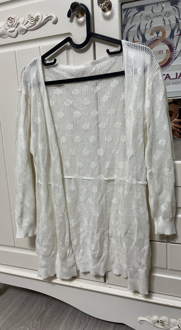 Beyaz örgü kadın hırka, uzun kollu ve bol kesim V yaka tasarıma sahiptir. Midi boyda, rahat ve bohem tarzda, günlük kullanım için uygundur. S M bedene uygundur. Bel kısmını ayarlamak için ipi de mevcuttur fotoğraflara ekledim
