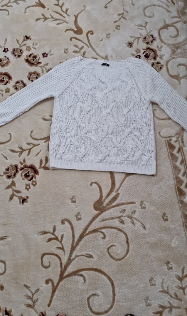 Beyaz renkte, örgü dokulu, uzun kollu ve yuvarlak yakalı kadın kazak. Rahat kesimi ve desensiz yapısıyla günlük kullanıma uygundur.