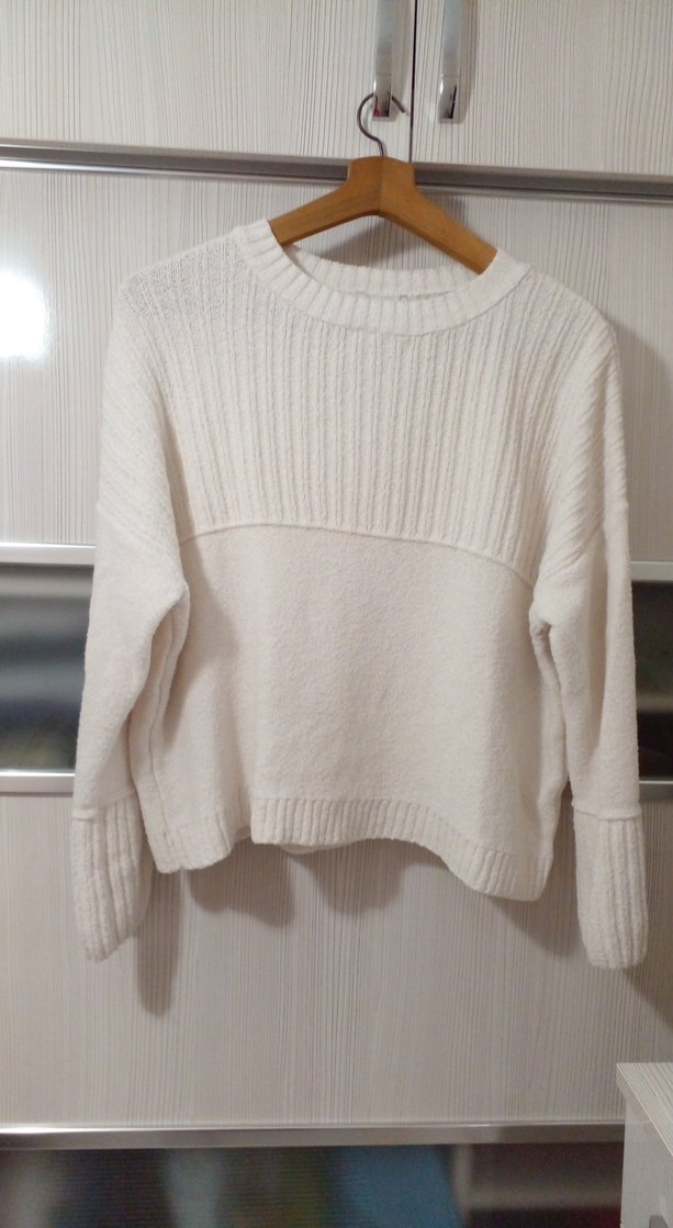 Bu beyaz örgü kadın kazak, yuvarlak yaka ve uzun kollu, bol kesimiyle rahat ve günlük kullanım için uygundur.