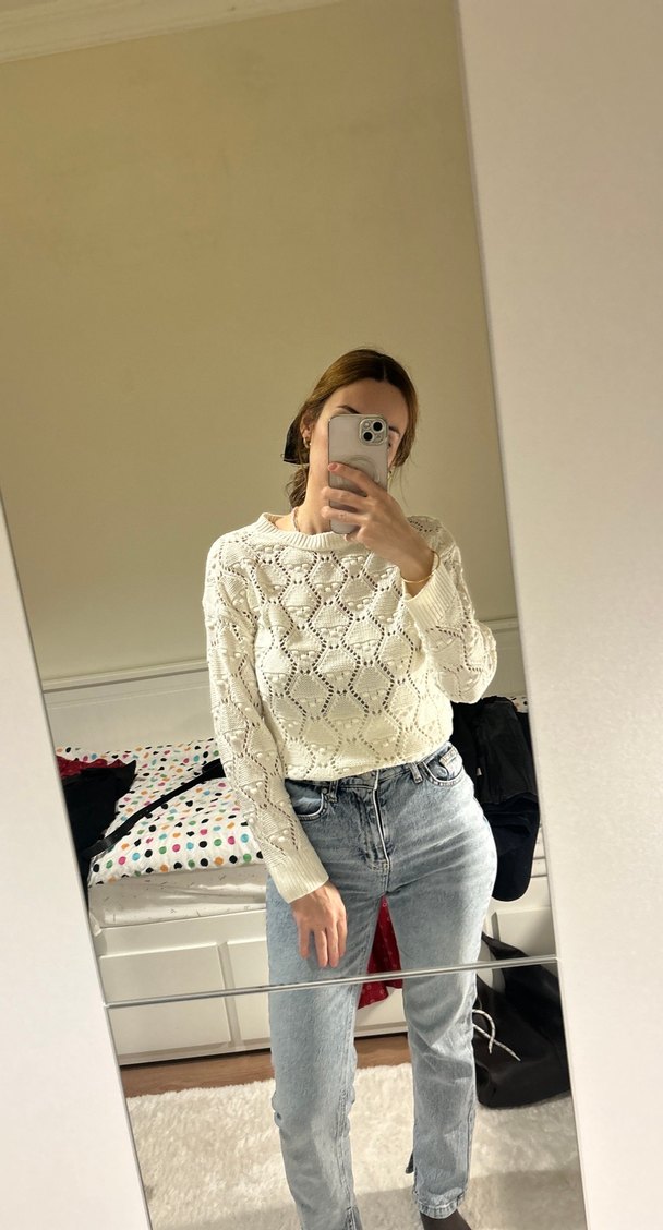 Beyaz renkli, örgü dokulu, uzun kollu ve bisiklet yaka kadın kazak. Salaş kesimi ve midi uzunluğu günlük kullanıma uygun rahat bir tarz sunar.