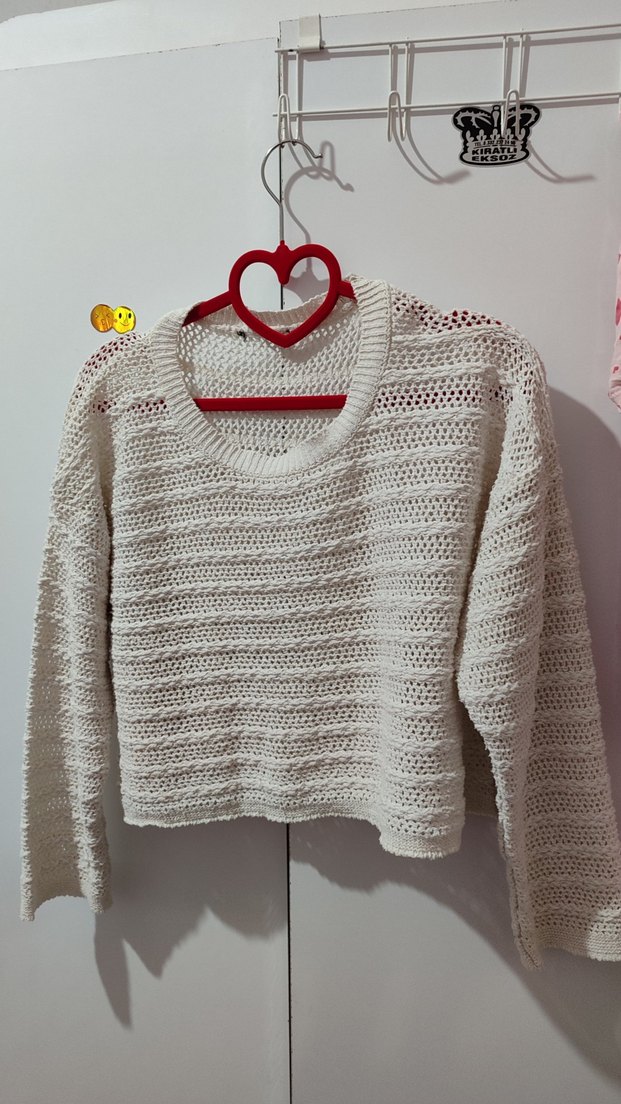Beyaz örgü kadın kazak ajurlu, uzun kollu ve yuvarlak yaka, bol kesim ve normal boyda, yumuşak örgü kumaştan, günlük rahat kullanım için uygun.