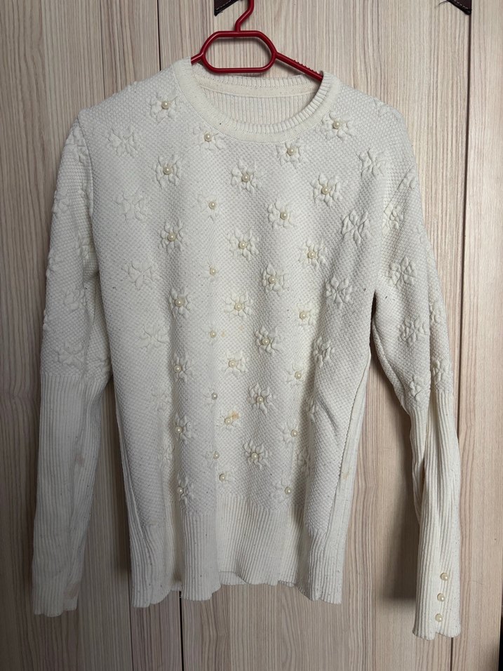 Beyaz örgü kadın kazak, yuvarlak yaka ve düğmeli uzun kollara sahiptir. Gevşek kesimi ve çiçek örgü desenleriyle bohem tarzda rahat bir modeldir.