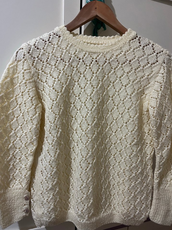 Beyaz örgü kadın kazak, yuvarlak yaka ve uzun kolludur. Bol kesimi ve vintage tarzıyla günlük kullanıma uygundur.