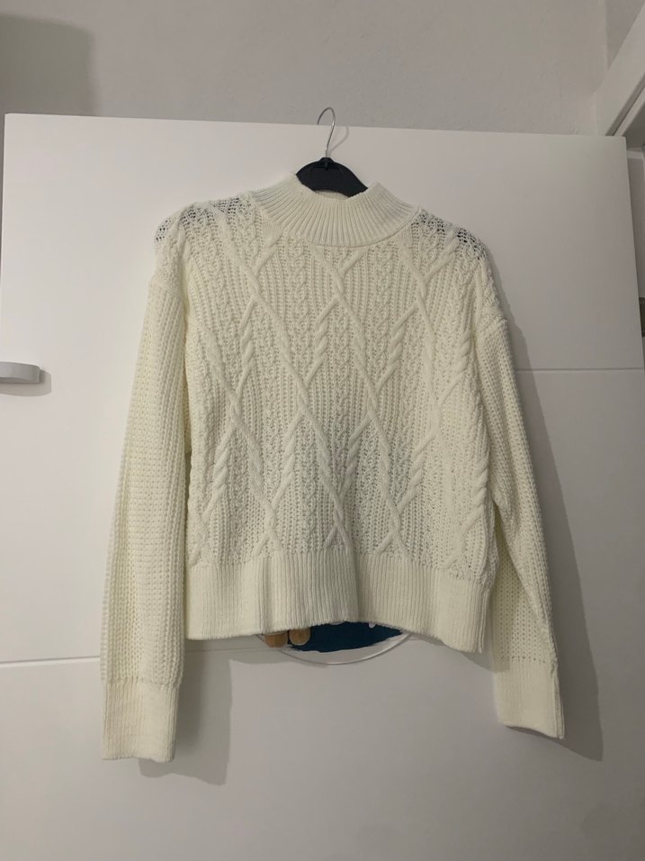 Bu beyaz örgü kazak, bol kesim, uzun kollu ve bisiklet yaka