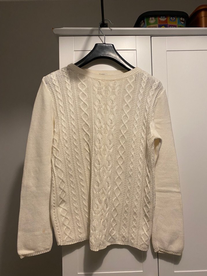 Beyaz renkli, örgü dokulu, yuvarlak yaka ve uzun kollu kadın kazak. Rahat kesimi ve sade tasarımıyla günlük kullanıma uygundur.