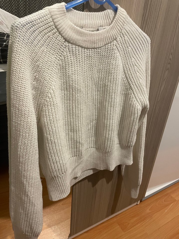 Beyaz renkli, örgü kadın kazak, uzun kollu ve bisiklet yaka detaylıdır. Rahat kesimi ve normal boyu ile günlük kullanıma uygundur.