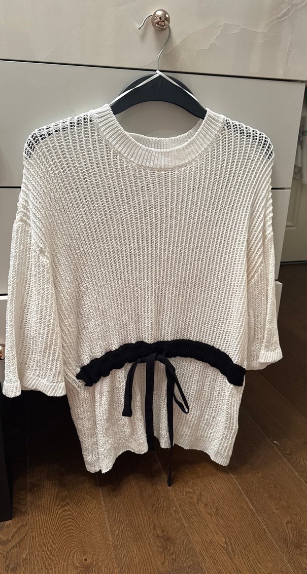 Siyah kurdele detaylı, belden sıkmalı, yuvarlak yakalı, örgü dokulu, bol kesim beyaz kadın kazak. Midi boyda, günlük ve sokak stiline uygun.