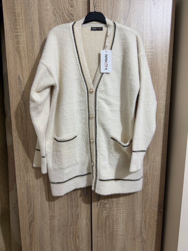 Bu beyaz örgü yün hırka, notlu yakalı ve uzun kolludur. Salaş kesim ve normal midi boydadır, kenar ve ceplerde ince gri detaylar bulunur. Trendy gündelik tarz için uygundur.