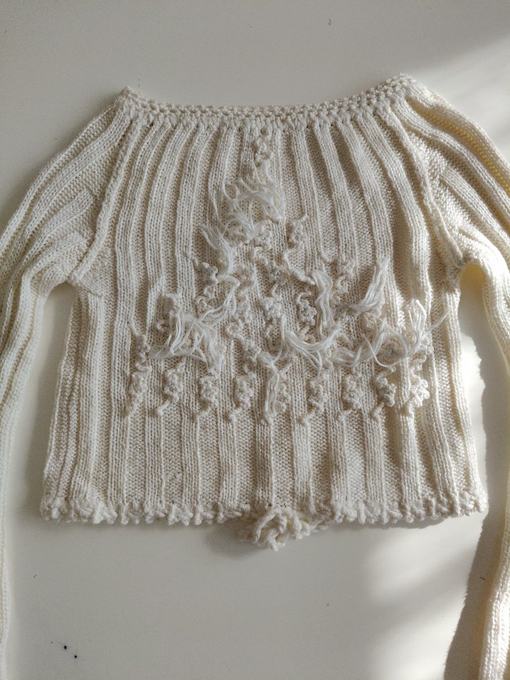 Uzun kollu, kayık yaka ve kısa kesim beyaz örgü kazak. Bohem tarzda, rahat ve salaş kesimle günlük kullanıma uygun.