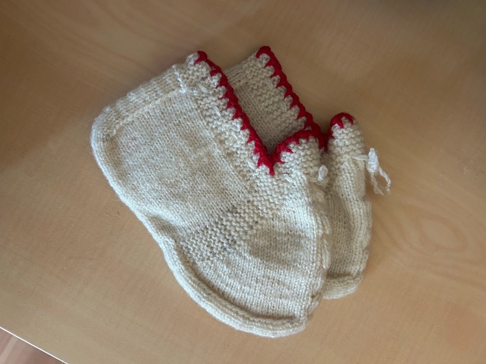 Yumuşak iplikten örülmüş, kırmızı kenarlıklı beyaz kadın patik. Klasik ve rahat bir tasarıma sahiptir.