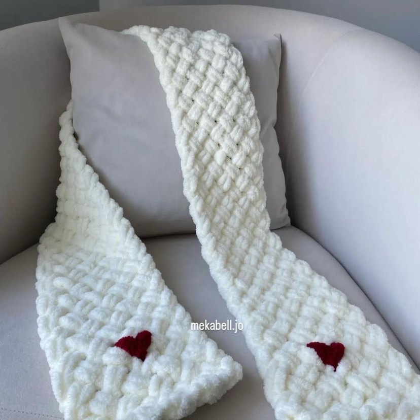 Beyaz örgü kadın şal, rahat dokusu ve küçük kırmızı kalp detaylarıyla bohem tarzını yansıtıyor.