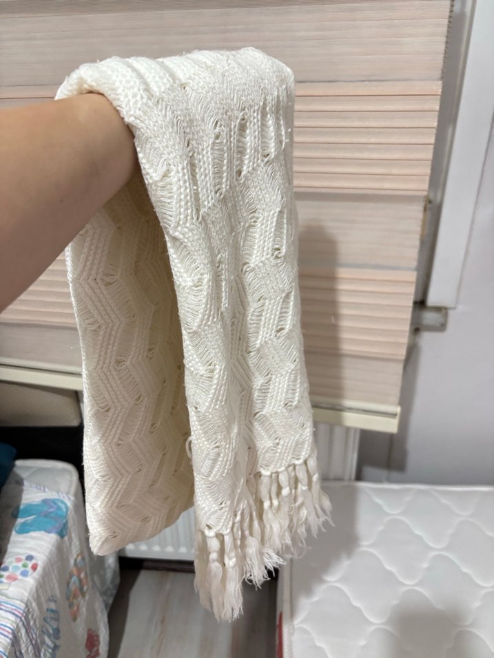 Beyaz renkte, örgü dokulu, püsküllü kadın şalı. Bohem ve retro tarzlara uygun, hafif ve rahat bir dokusu vardır.