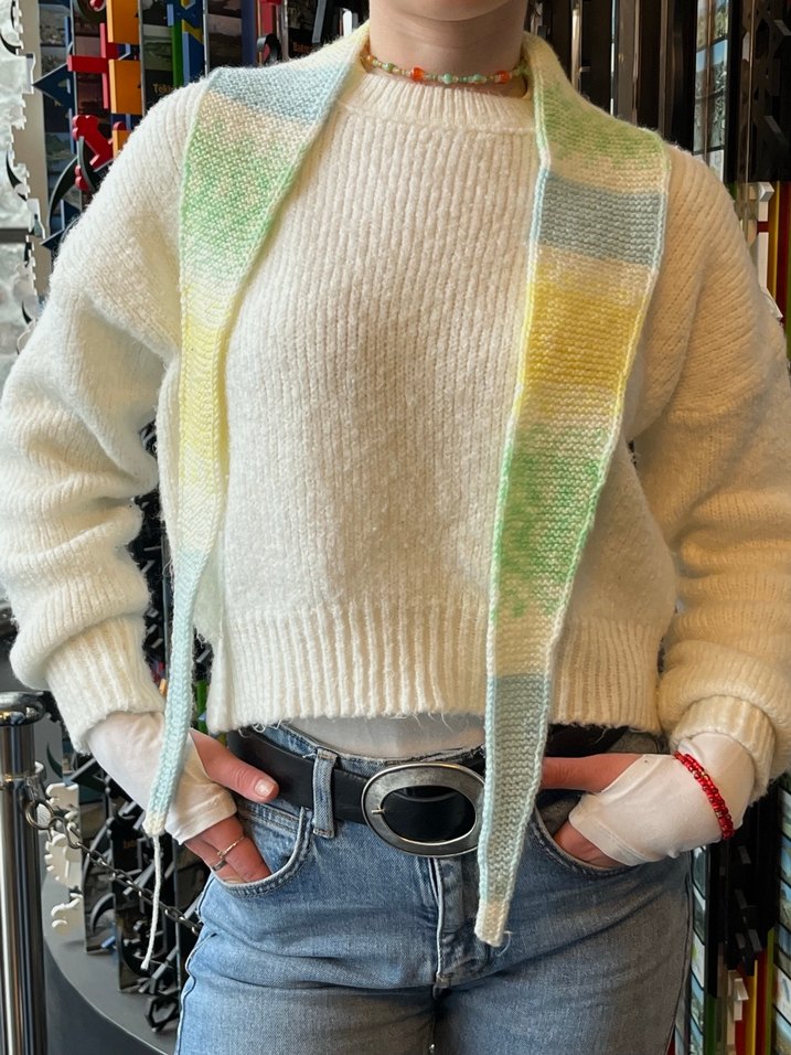 Yumuşak örgüden yapılmış, beyaz ve pastel renkli detaylara sahip kadın şalı, rahat ve bohem tarzda.