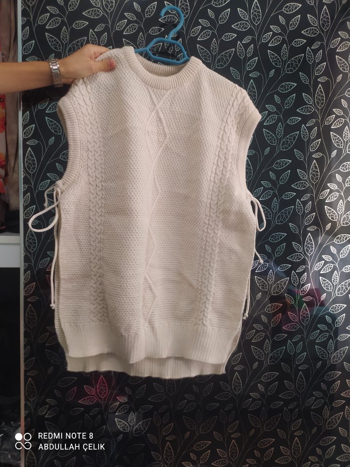 Beyaz, örgü dokulu, kolsuz süveter. Yuvarlak yaka ve bol kesimiyle rahat bir kullanım sunar. Midi boyu ve sıcak dokusu günlük kullanıma uygundur.