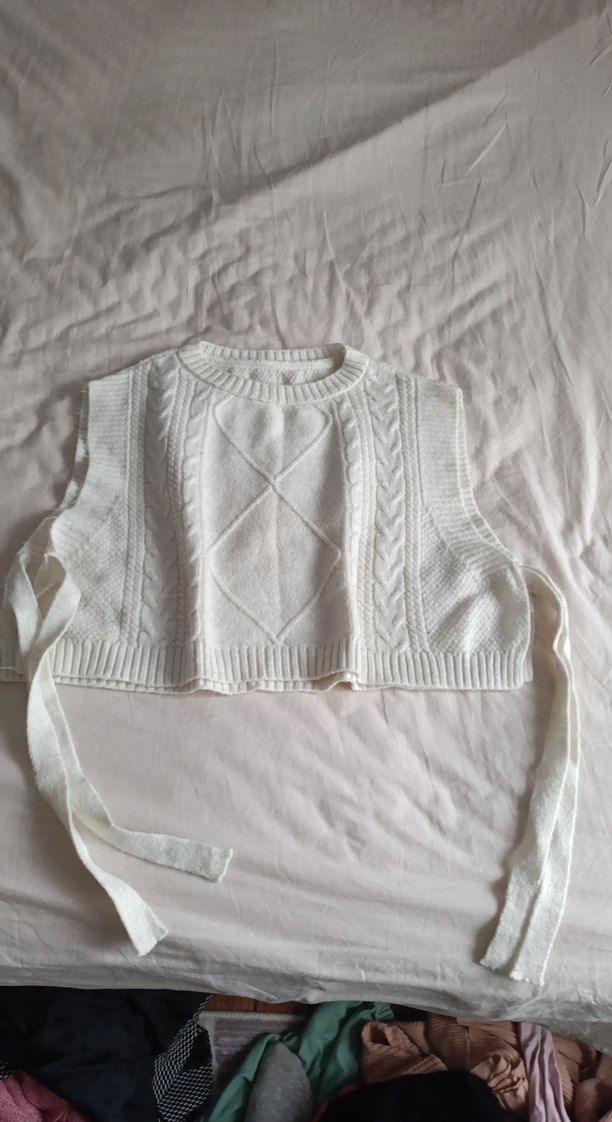 Beyaz örgü, kolsuz süveter, yuvarlak yaka ve bol kesim. Normal boy, yanlarda bağlama detaylı, rahat ve bohem tarzda.