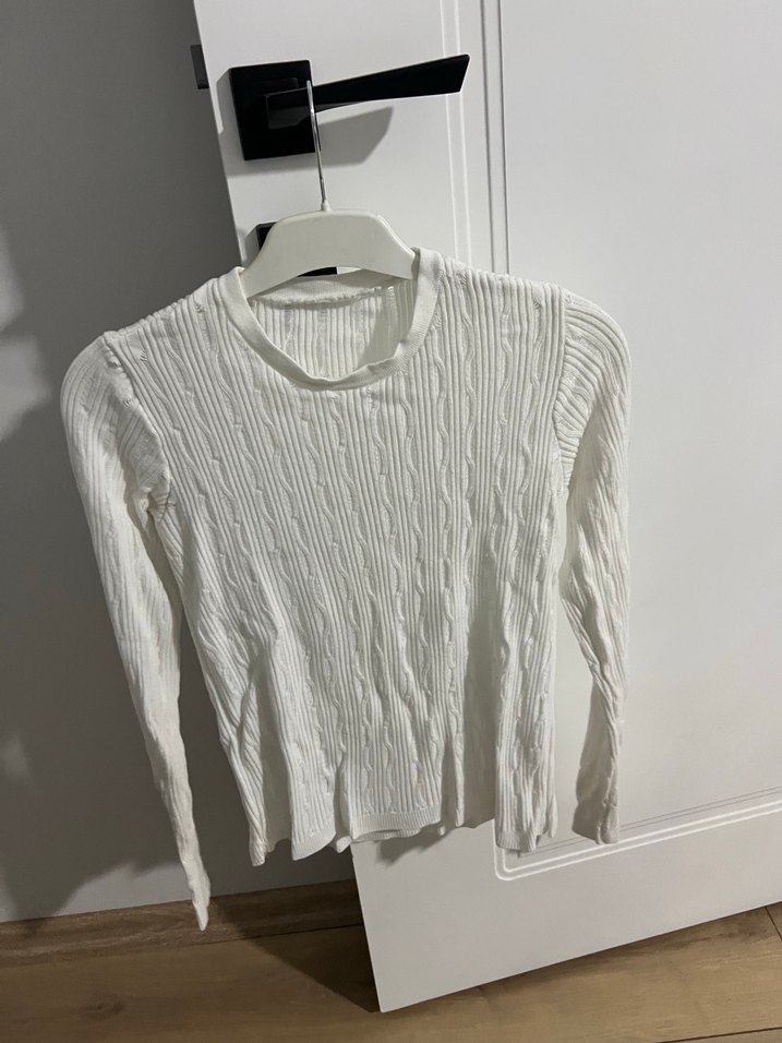 Beyaz renkli kadın örgü triko, uzun kollu ve fitted kesimlidir. Yumuşak keten kumaştan üretilmiş, minimal desen içermeyen dokulu bir tasarıma sahiptir. Çok zor görünen bi lekesi olduğundan ucuz veriyorum inanın belli olmuyor