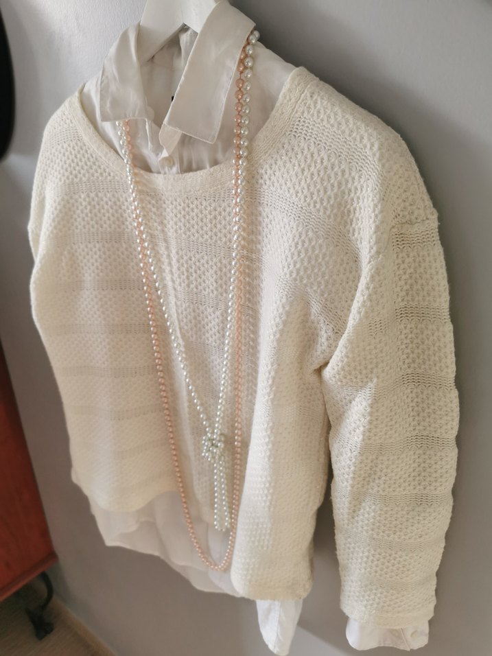 Beyaz, gevşek kesim, uzun kollu, yuvarlak yakalı örgü triko. Yumuşak dokulu ve midi boyda, günlük rahat kullanım için uygundur.