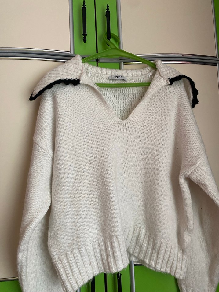 Beyaz renkli, örgü kumaştan yapılmış, yakalı ve uzun kollu bol kesim triko kazak. Günlük kullanıma uygun rahat ve sıcak bir modeldir.