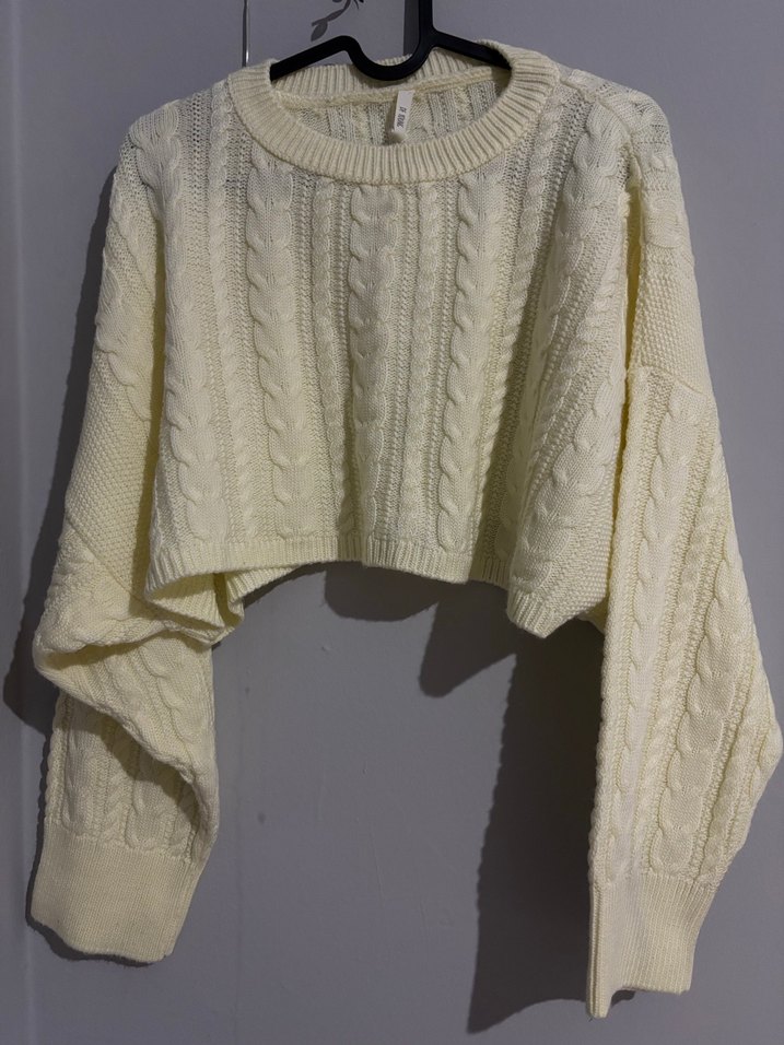 Beyaz renkli, örgü kumaştan yapılmış, bol kesim, uzun kollu ve yuvarlak yakalı kadın triko kazak. Rahat ve gündelik kullanıma uygun normcore tarzında, pastel tonlarda. Outletten aldım denemeden alma hatası yaptığım için bedeni olmadı giyemedim bol geldi