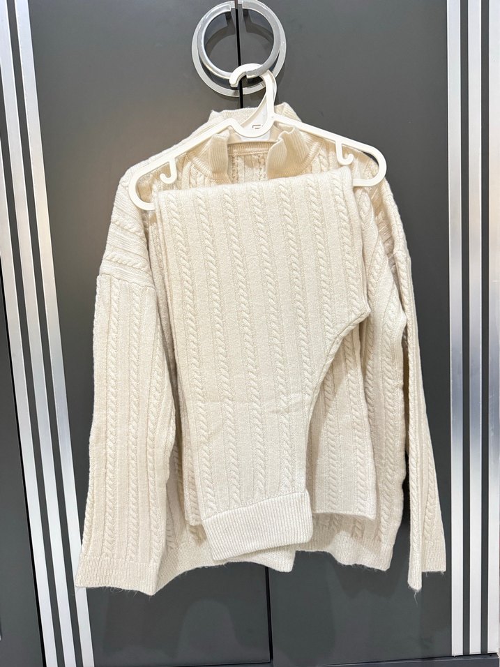 Beyaz örgü kadın triko kazak, yüksek yaka ve uzun kollu, bol kesimiyle rahat ve trend bir görünüm sunar. Desensiz ve midi boyuyla günlük kullanıma uygundur. Krem rengi hiç giyilmedi.