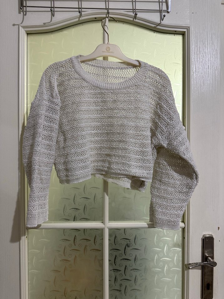 Beyaz renkte, yuvarlak yaka ve uzun kollu, bol kesim örgü kadın triko kazak, rahat ve günlük kullanım için uygundur.