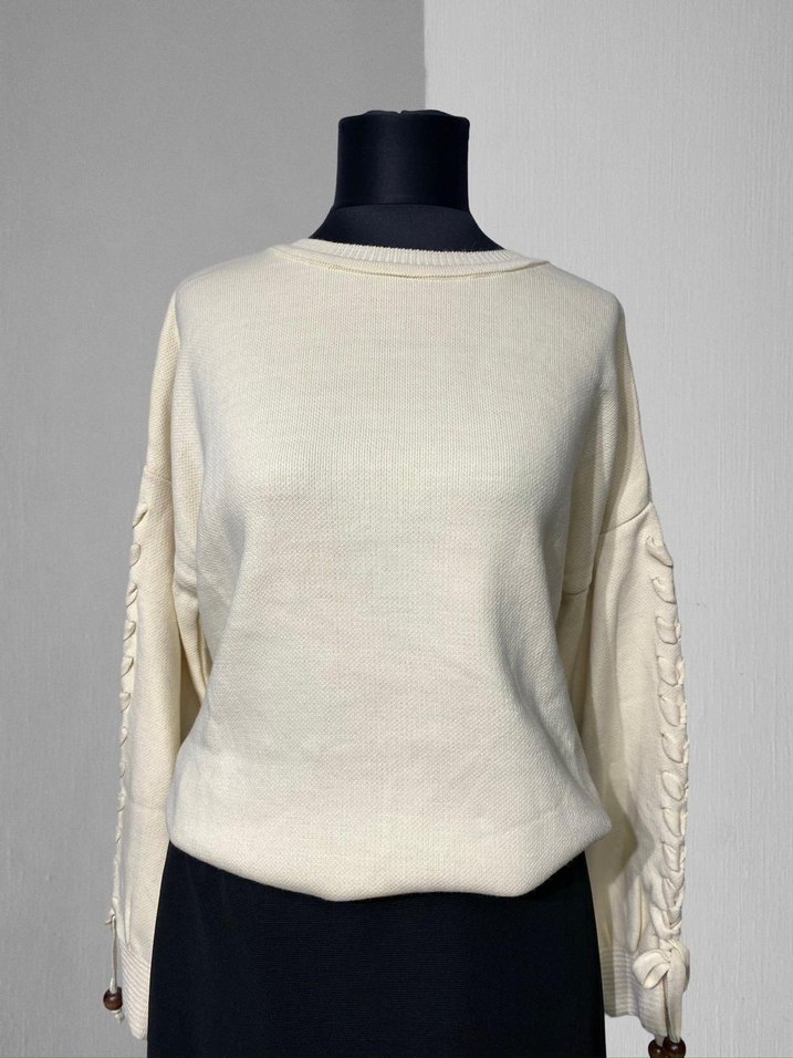 Beyaz renkli, yuvarlak yakalı ve örgü detaylı uzun kollu triko kazak. Salaş kesim ve tunik boyda, günlük sokak stili için uygundur.