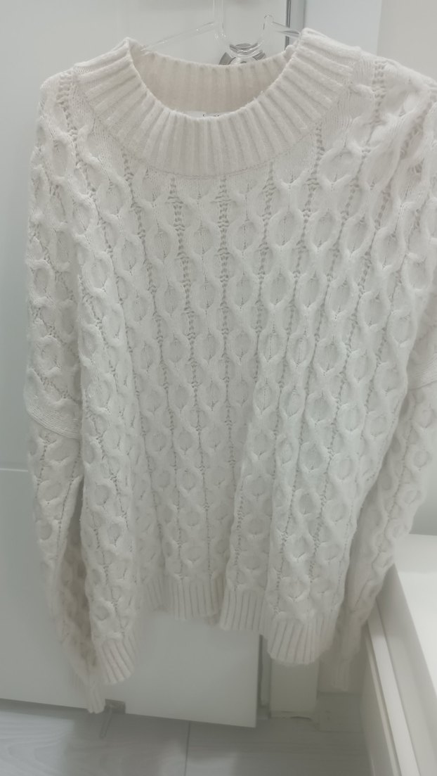 Beyaz örgü kadın triko kazak, yuvarlak yaka ve uzun kolludur. Rahat kesimi ve desensiz tasarımıyla günlük kullanıma uygundur.