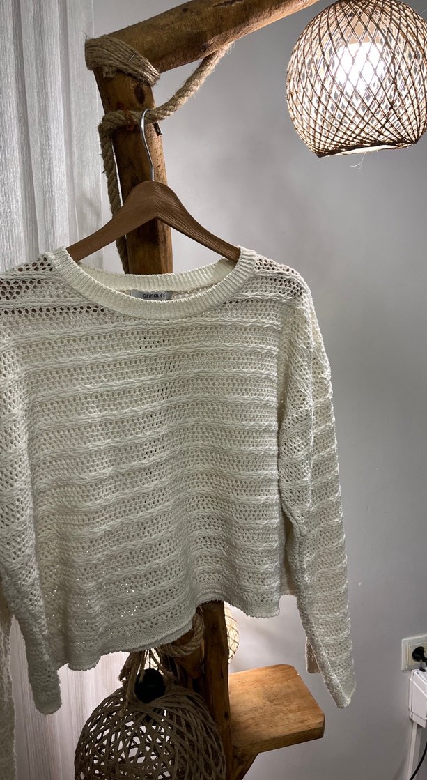 Beyaz örgü kumaştan, yuvarlak yakalı ve uzun kollu, bol kesim, normal uzunlukta bohem tarz kadın triko kazak.