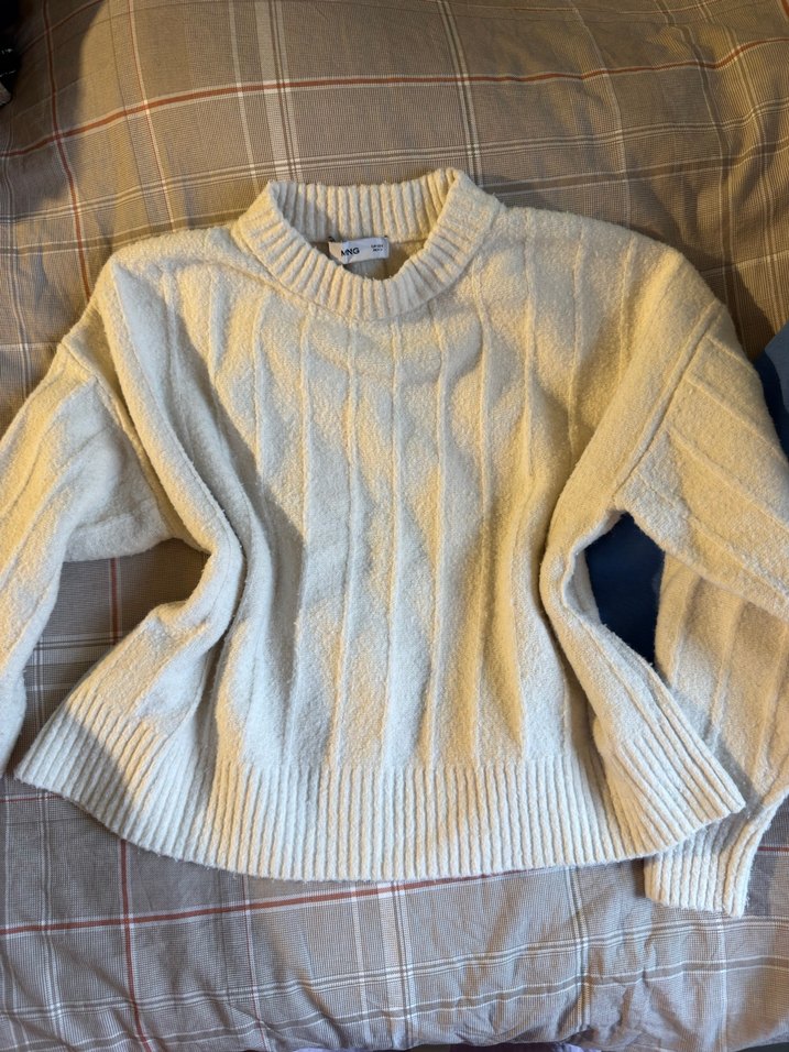 Yumuşak örgü kumaştan, uzun kollu, yuvarlak yaka ve bol kesim beyaz triko kazak. Günlük rahatlık için ideal, konforlu ve sade tarzda.