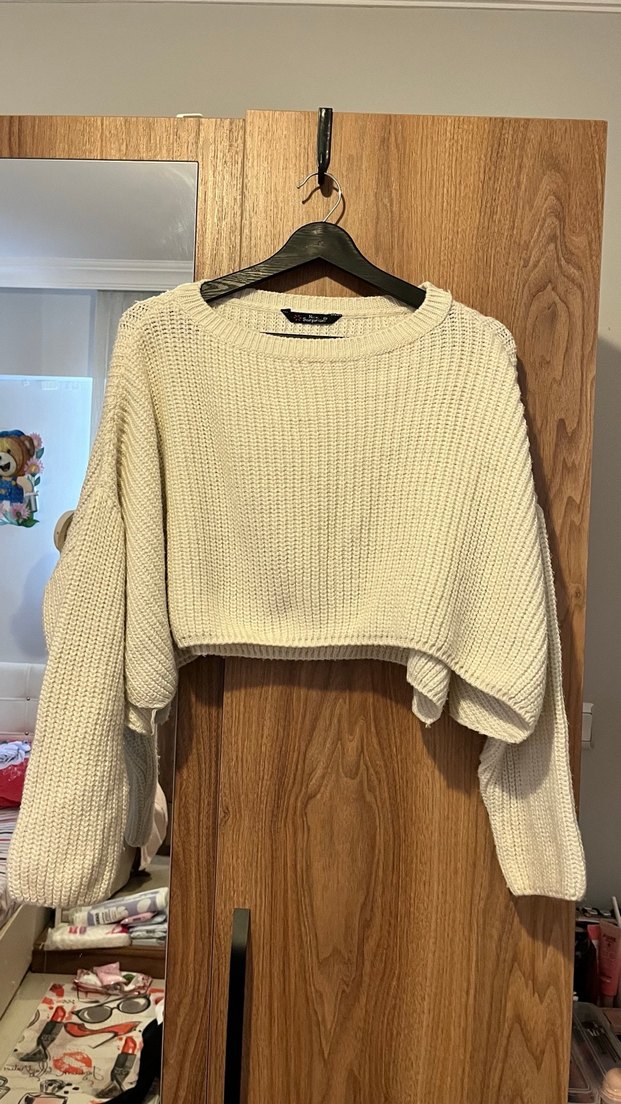 Beyaz renkli, uzun kollu, yuvarlak yakalı örgü kadın triko kazak. Rahat, bol kesimiyle günlük sokak stiline uygun.