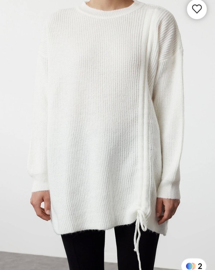 Beyaz örgü kadın triko kazak, yuvarlak yaka ve uzun kollu. Rahat, bol kesim ve normal boyda, etek kısmında ince bağcık detayı bulunur.