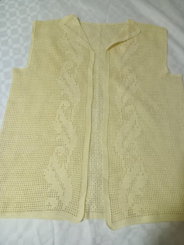 Beyaz, örgü kumaştan V yakalı kadın yelek. Kolsuz ve normal kesimdir. Günlük kullanıma uygun, sade ve pastel renklidir.