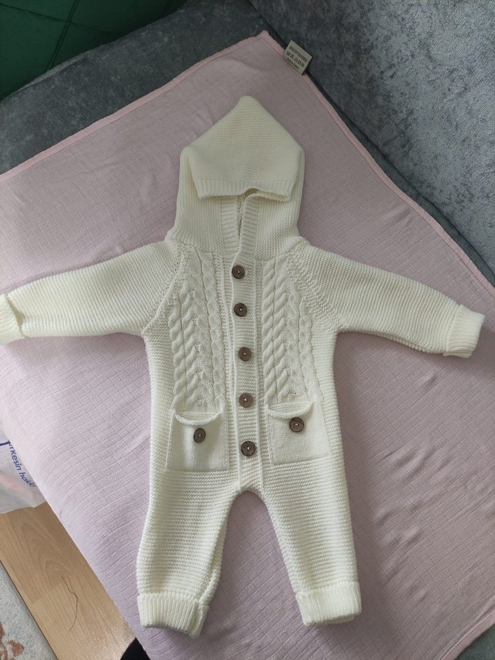 Uzun kollu, kapüşonlu ve düğmeli önüyle örgü bebek tulumu. Yumuşak dokulu, cepli ve açık beyaz renkte örme kumaştan.2 kez giydirdim kusursuz