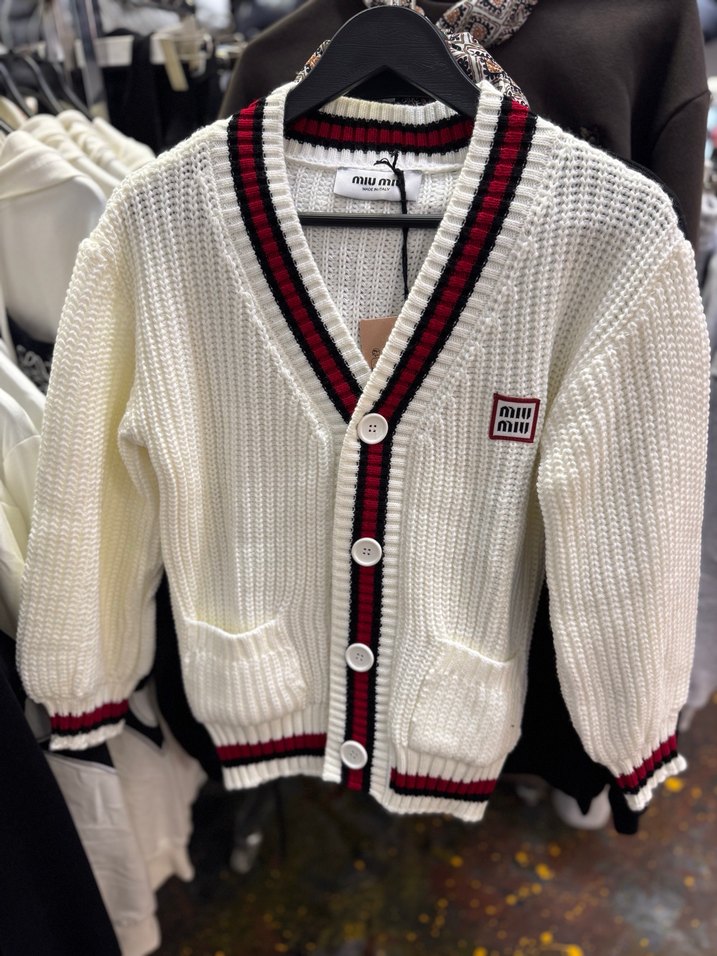 Bu beyaz örgü kazak , kırmızı ve siyah çizgili detaylarla geniş kesim ve uzun kolludur. Önde düğmeli ve iki cep bulunur, sokak stiline uygundur.