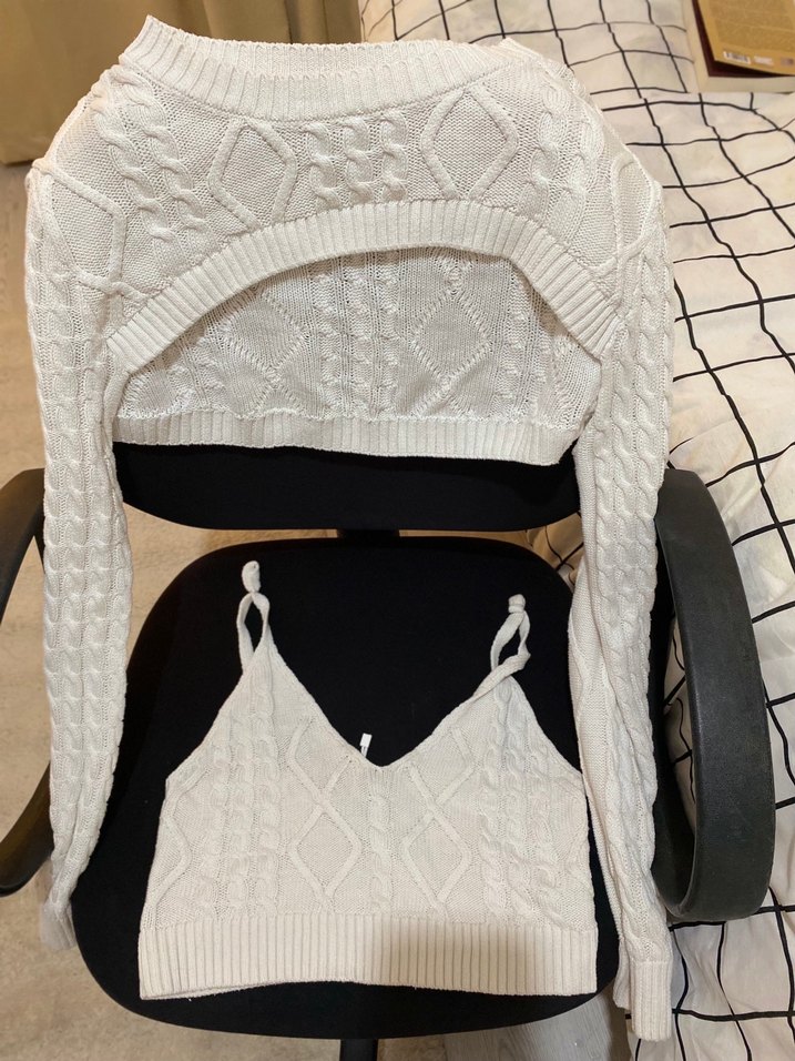 Beyaz örgü kadın kazak, straplez kesim, uzun kollu ve baskılı desenli, günlük rahat kullanım için uygundur. ✨