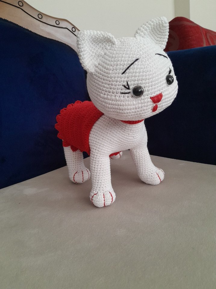 Renkli kırmızı detaylara sahip beyaz örgü peluş kedi, yumuşak dokulu ve sevimli ifadelere sahip el yapımı oyuncak.