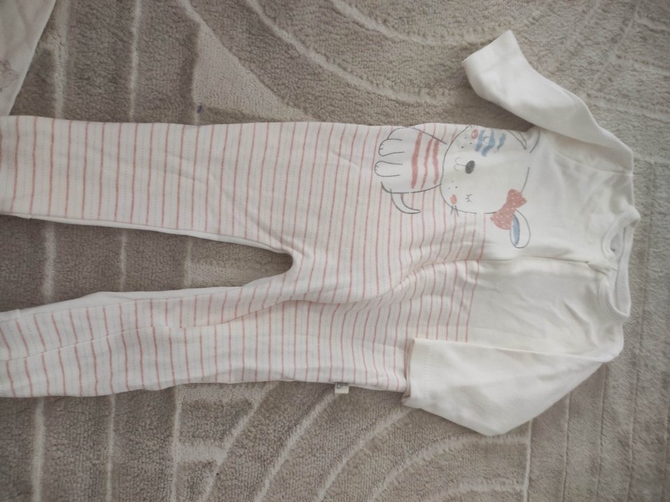 Beyaz renkte, pastel çizgili ve örgü kumaştan yapılmış, sade kedi figürlü tulum.