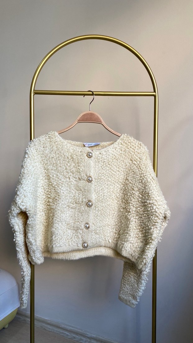 Beyaz örgü kumaştan, uzun kollu, yuvarlak yakalı, kısa ve bol kesim kadın hırkasıdır. Günlük kullanıma uygundur. ✨
