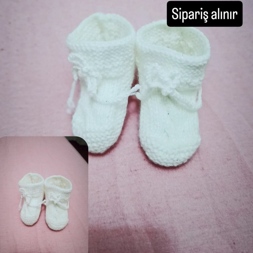 Beyaz örgü kız bebek patik, sade ve klasik tasarıma sahip, yumuşak pastel renkte, örme ve desensizdir.