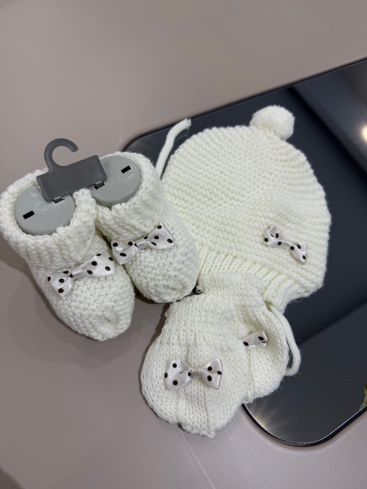 Beyaz örgü kız bebek patik ve bere seti, puantiyeli fiyonk işlemeleriyle süslenmiştir. Hiç kullanılmamıştır