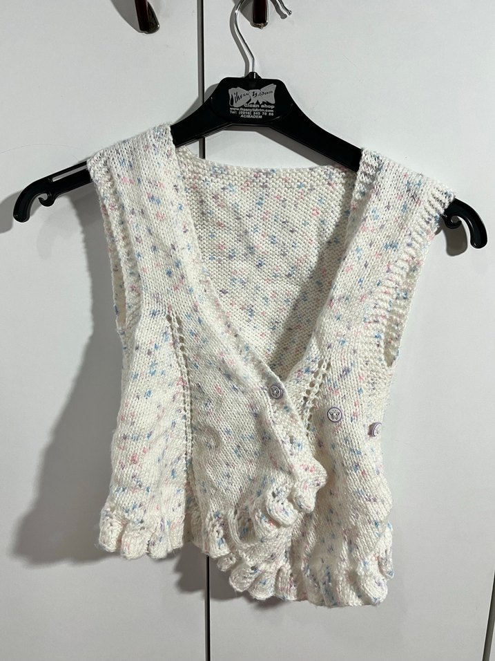 Beyaz, kolsuz ve fitted kesim kız çocuk yeleği, örgü dokusu ve pastel tonlarda tie-dye desenlere sahiptir. Askısız yakalı ve düğmeli bohem tarzda.