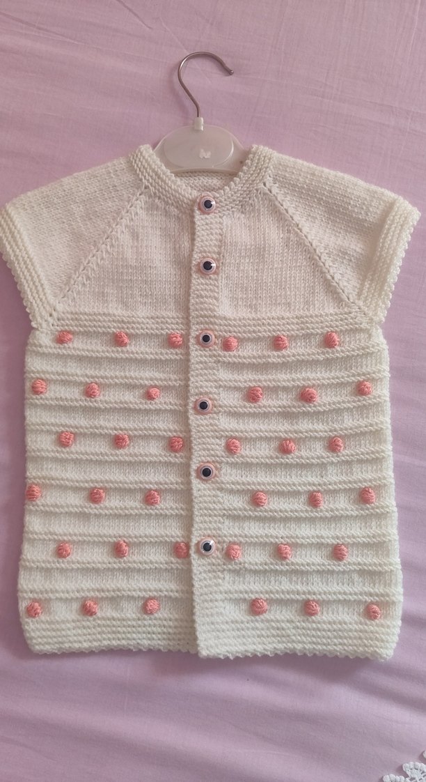 Beyaz örgü kumaştan, pembe küçük dokulu detaylarla süslenmiş kolsuz, bohem tarzda kız çocuk hırkası. Düğmeli ve yumuşak dokulu.