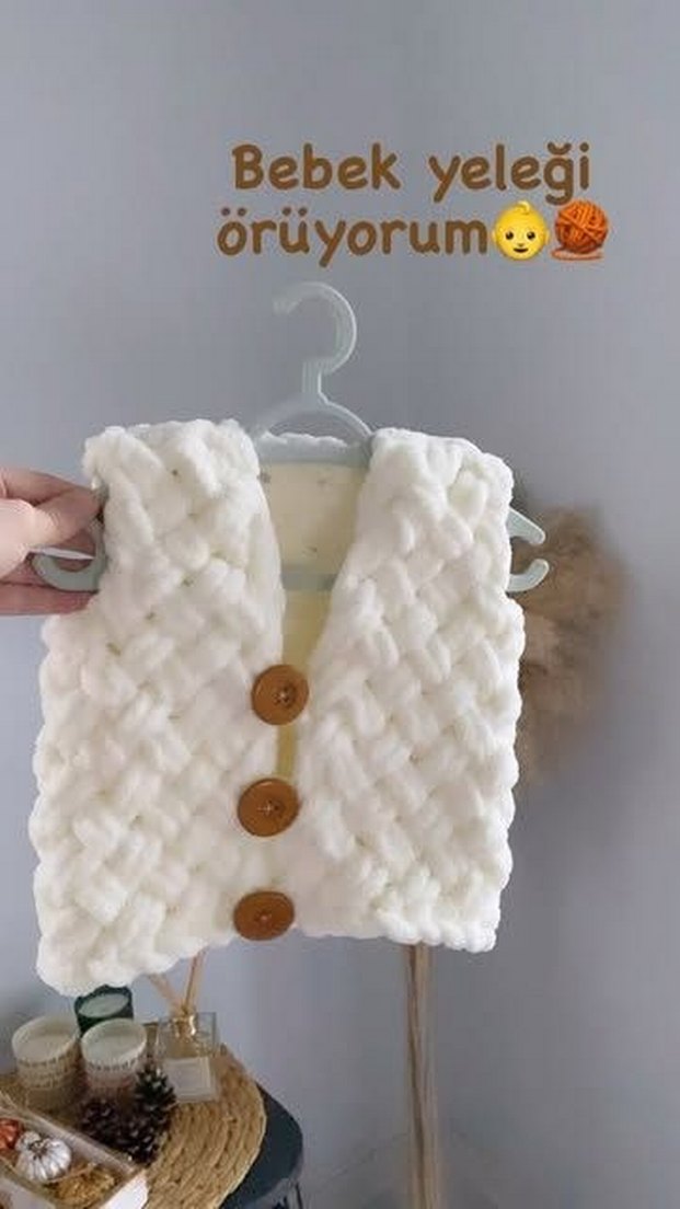 kendim örüyorum temizdir guvenli gonderim sağlarım bebeginize çok yakışıcak Beyaz renkli, örgü kız çocuk yeleği, düğmeli ve kolsuz. Bohem tarzda, düz ve vücuda oturan kesime sahip sipariş için dmm