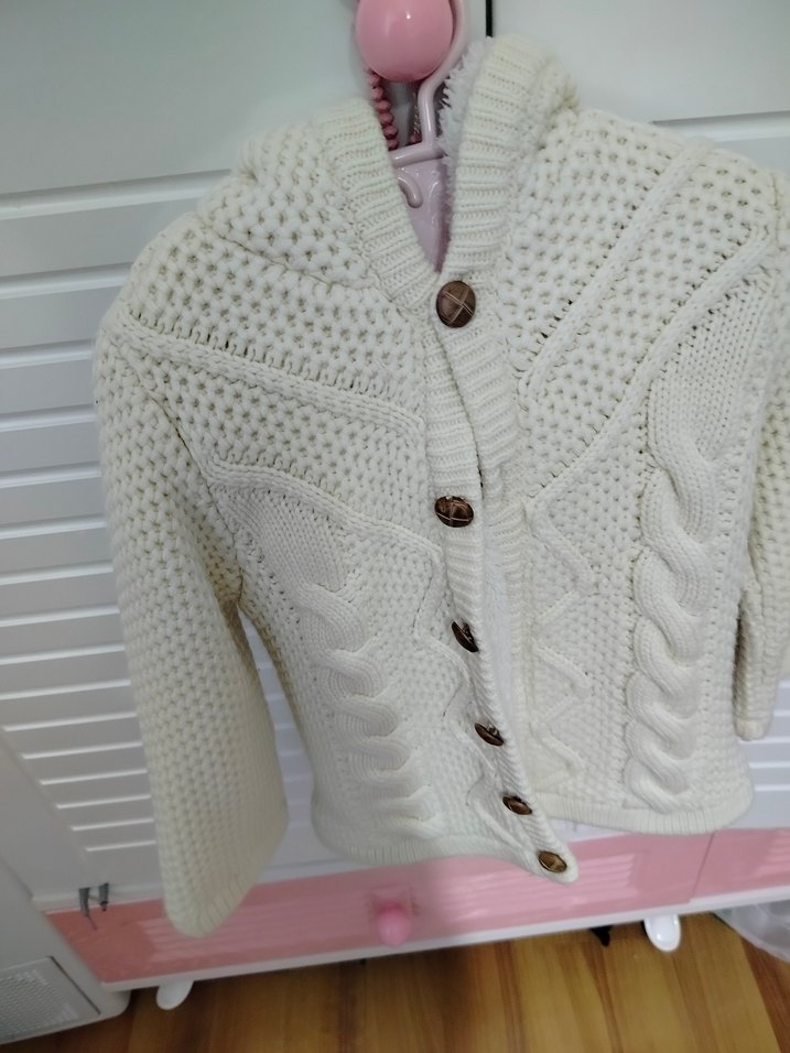 Beyaz, uzun kollu, örgü kız hırka. Bohem tarzı ve dokulu örgü deseni ile düğmeli, vücuda oturan kesim. Sayılı gıyıldı