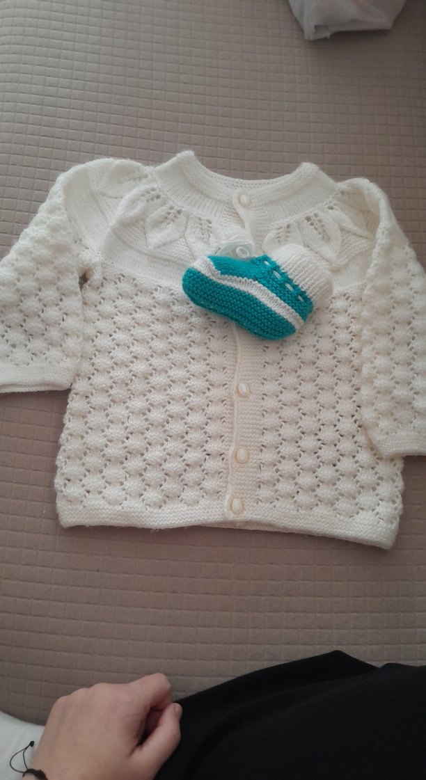 Bu beyaz örgü kız hırkası, uzun kollu ve bol kesimdir. Yumuşak örgü kumaştan yapılmış, sade ve hafif bir tarza sahiptir.