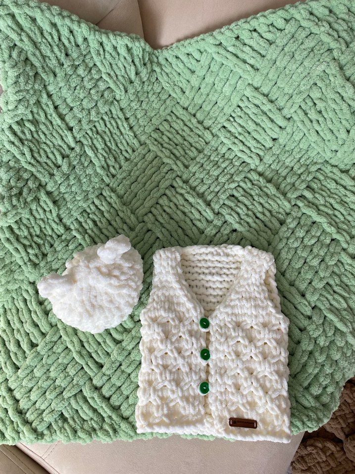 Beyaz Örgü Kolsuz Bebek yelek ve küp şeker model battaniye Seti