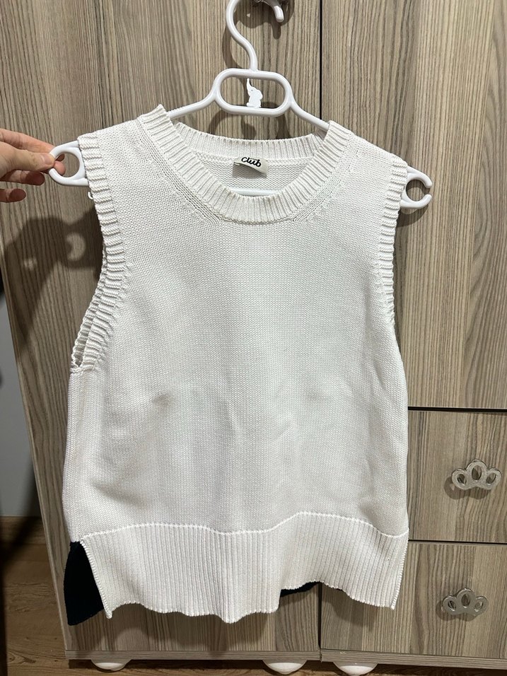 Beyaz renkli, örgü dokulu, kolsuz ve yuvarlak yakalı kadın süveter. Günlük sokak stiline uygun, vücuda oturan kesimde.
