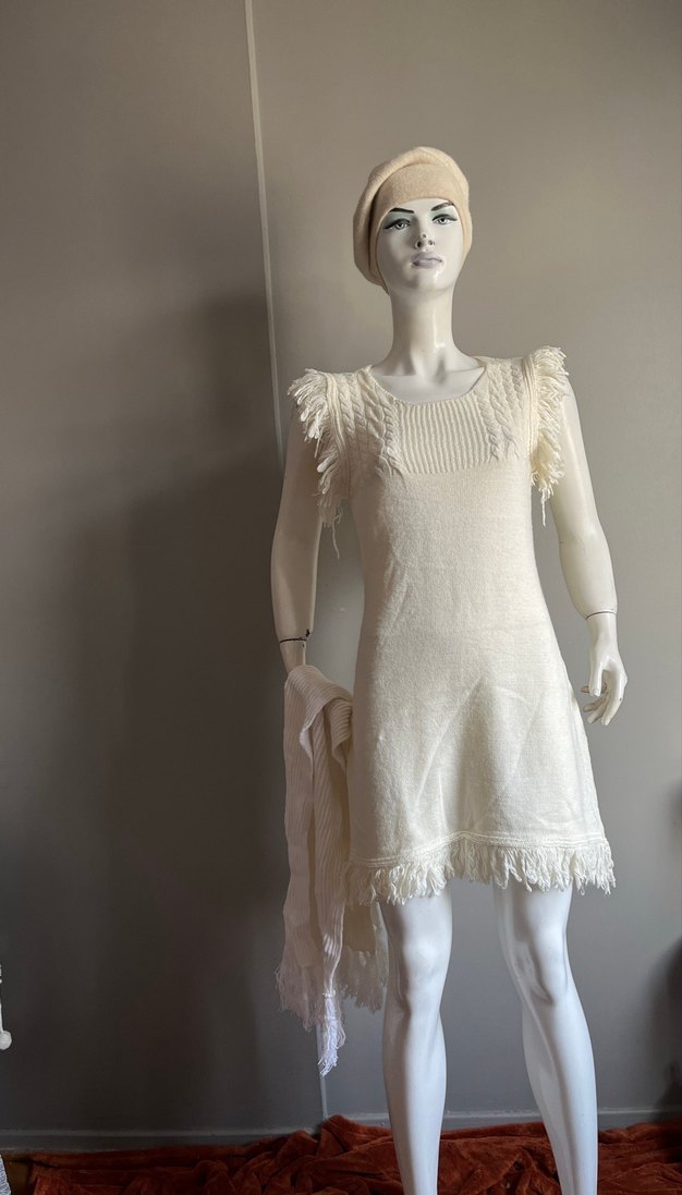 Beyaz renkli, kolsuz, örgü mini elbise, omuz ve etek kısmında püskül detaylarıyla bohem ve rahat bir tarz sunar. Günlük kullanım için uygundur.