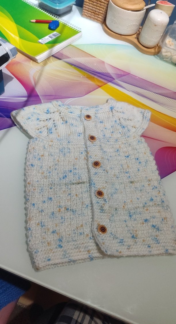 Bu beyaz örgü kolsuz mini hırka, rahat kesimi ve V yaka tasarımıyla günlük kullanıma uygundur. Ahşap düğmeler ve pastel noktalar içerir.