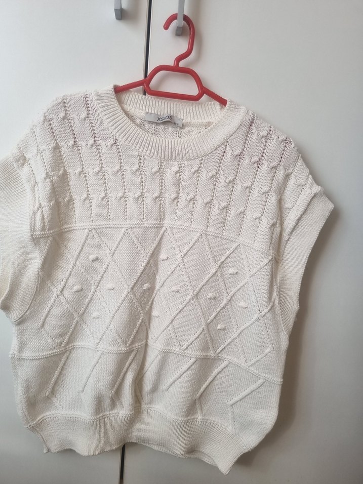 Beyaz renk, kolsuz, kısa boy ve salaş kesim örgü kazak. Bisiklet yaka ve sade deseniyle günlük sokak stiline uygun, rahat bir model.